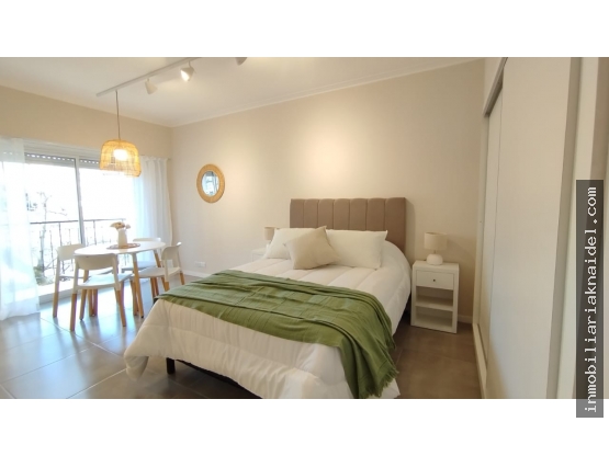 UN AMBIENTE RECICLADO CON BALCÓN A LA CALLE. Amplio ambiente externo, con balcón saliente a la calle en vereda de sol. Cocina integrada, reciclada con ventana a la calle. Baño completo reciclado con ducha. Placard empotrado. Pisos cerámicos. Muebles a estrenar. Decorado. EXCELENTE ESTADO.